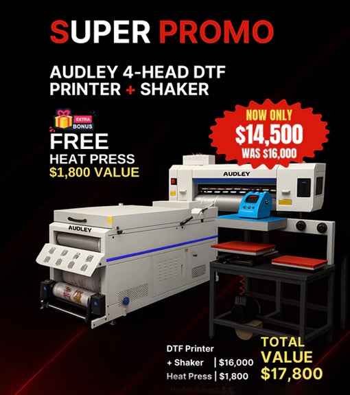 Grab the AUDLEY 4-Head DTF Printer + Shaker with an extra bonus free Heat Press ($1,800 value). Total bundle worth $17,800, now only $14,500! Don’t miss out — limited time offer.